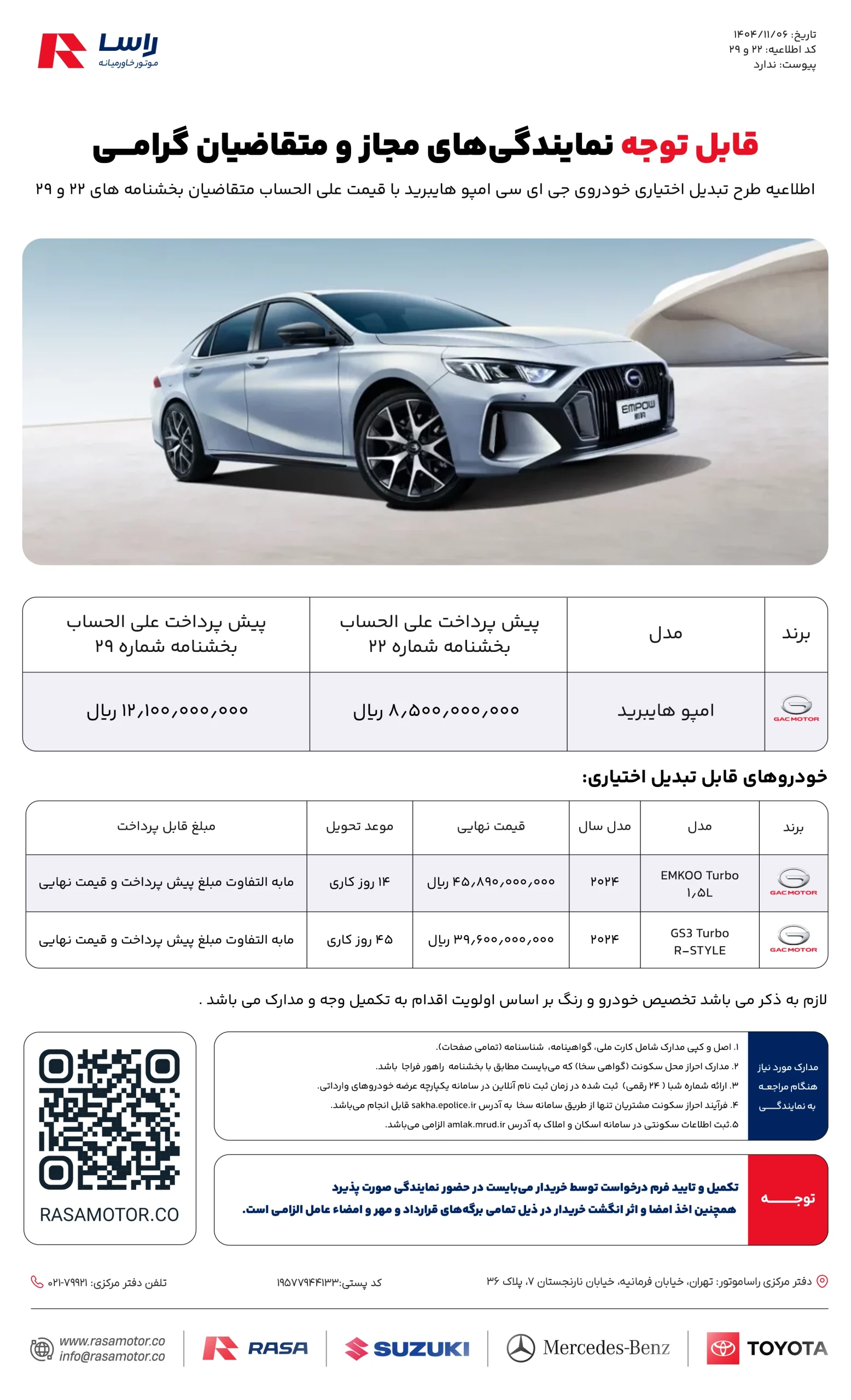 آغاز ثبتنام خودروهای مرسدس بنز و تویوتا ویژه جانبازان معزز - شرکت راسا موتور خاورمیانه، اقدام به عرضه خودروهای وارداتی مرسدس بنز و تویوتا با شرایط ویژه مختص جانبازان معزز نموده است.