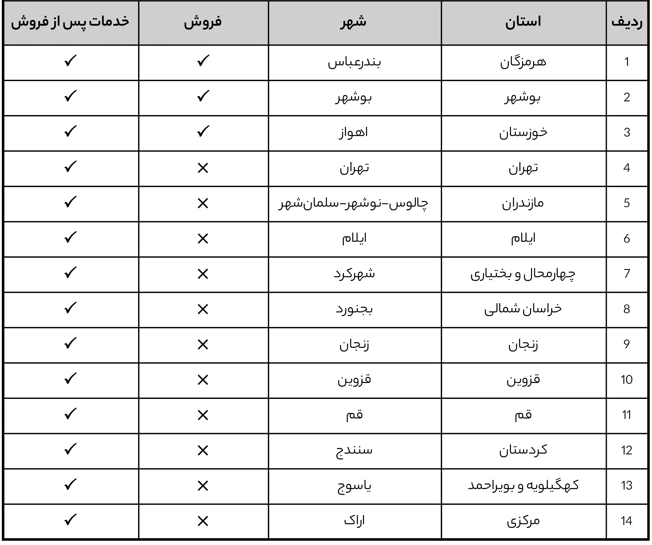 لازم به ذکر است ارسال تقاضا صرفاً جهت بررسی برای شهرهای قید شده در جدول ذیل بوده و هیچگونه حقی را برای متقاضی ایجاد نمیکند.